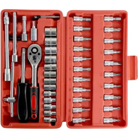 Completo e Versátil: Com 46 peças, incluindo soquetes, chaves de fenda, chaves inglesas e mais, você terá todas as ferramentas essenciais ao seu alcance.Qualidade Superior: Fabricadas com aço cromo vanádio, nossas ferramentas são feitas para durar. Não comprometemos a qualidade, garantindo desempenho excepcional em cada uso.Praticidade em Movimento..